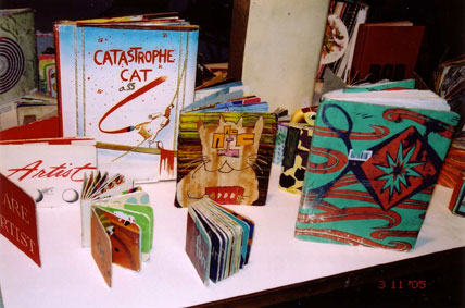 The installation, a collection of approx. 60 handpainted & collaged books of varying sizes, (some done in collaboration with artist/friends), arrayed on a large wooden table, was presented at CANADA, as part of a 3 PERSON SHOW – which opened on MARCH 11, 2005.