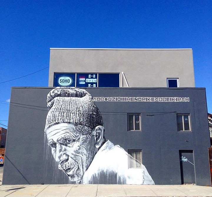 it is also striking, because it is the portrait of an old man, a common man, not a rapper, not a dead poet. not a cartoon character. not a cypher, not even a ‘militant’ citizen of the streets. it is the deeply felt portrait of an old man of the real streets, the real streets . . of Morocco. I guess that makes it: realism. it’s a kind of grim realism, in truth, or maybe ‘gritty’ is the better word. it’s not stylized, it’s not comic. ECB calls this series ‘Trades’ and its subjects are the old school skilled artisans who are often overlooked, but are the gears that keep things running. Oulad Bouzid III is a street barber. it’s a global project.
