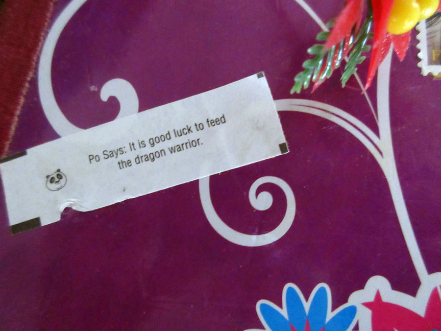 the fortune cookie paper slip: ‘Po Says: It is good luck to feed the dragon warrior.”