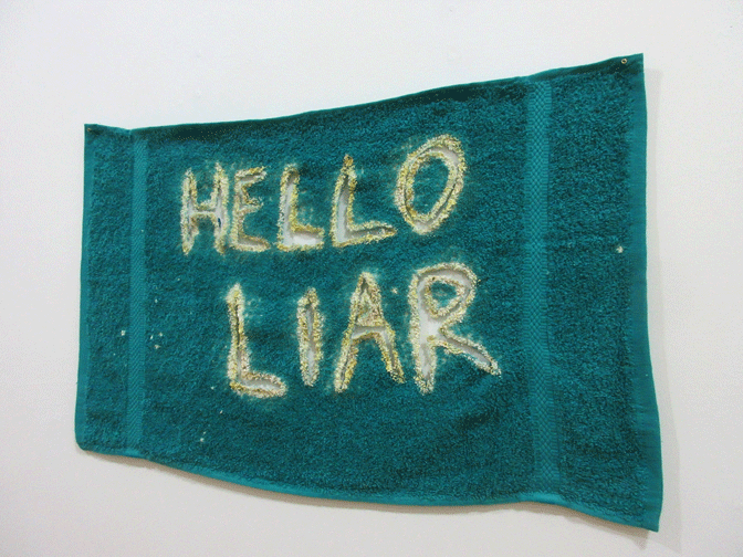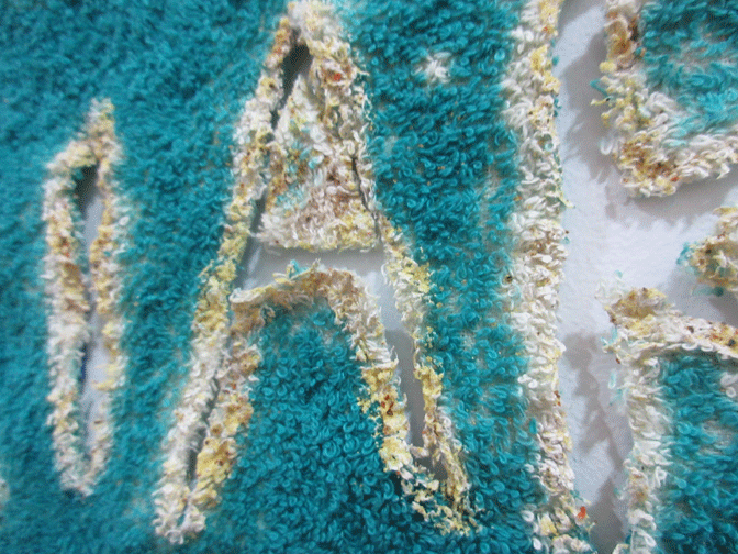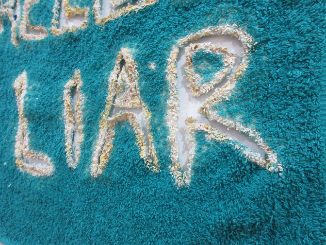 Bleach, tajin, sand, acrylic on hand towel. 16 x 26 in.