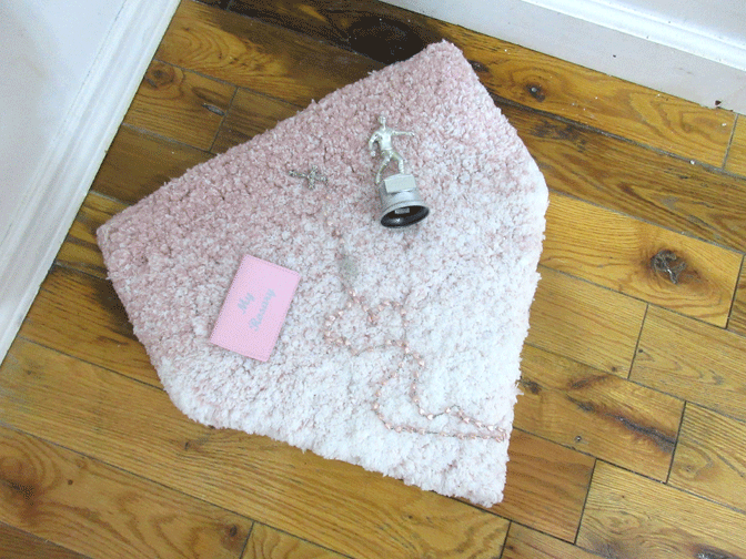 I liked how it referenced the ‘texture’ in the title. plush carpet, silvery, thin metallic snaking chain, more solid miniature souvenir trophy, & the abrupt, plastic pink, of the shiny, retro vinyl rosary ‘envelope’.