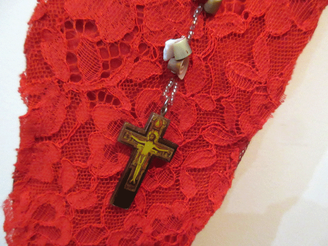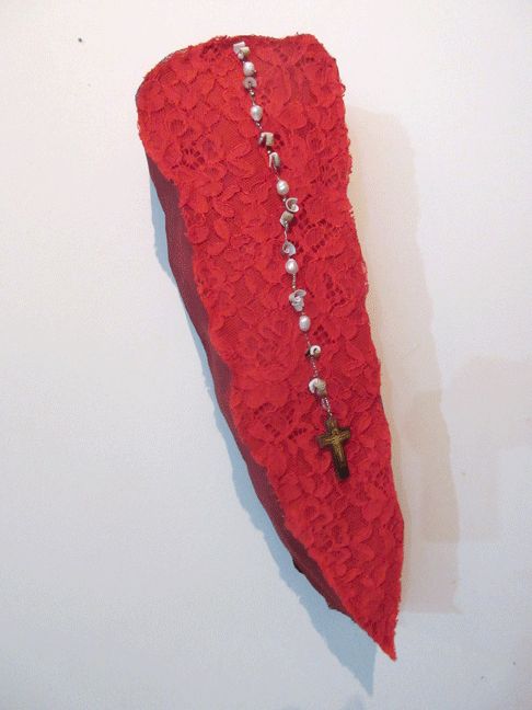 lace, felt, rosary, wire spray. 5.5 x 17 in.