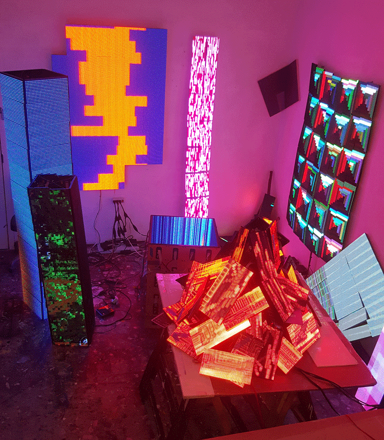 “new digital sculptures comprised of LED matrix panels .. programmed by the artist . . seeking an absurd entry into the sublime – with cords and hardware exposed.”