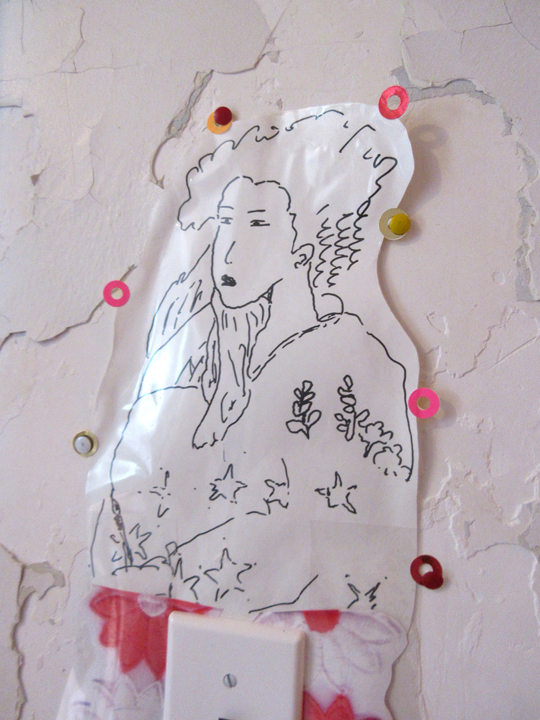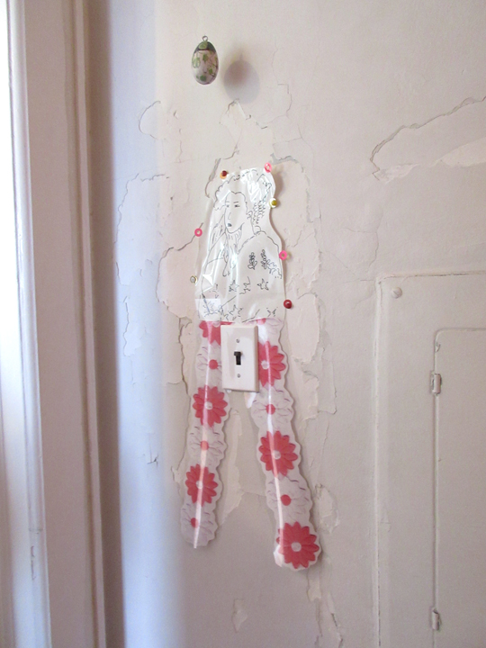 photocopy & mylar collage / attached to – a plastic light switch cover.