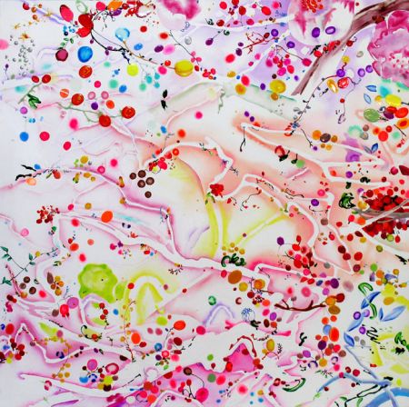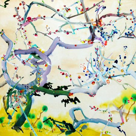 The paintings of intertwining tree branches incorporate drops of brightly colored