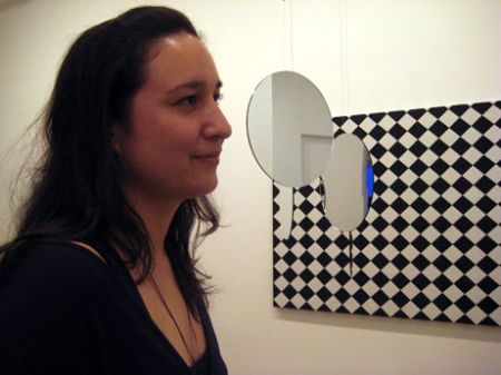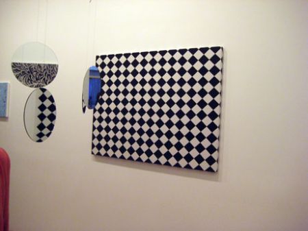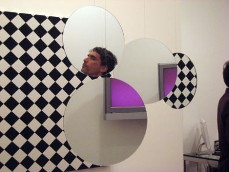 ANNE EASTMAN, ‘Let Go of Your Ego’, 2008, 3 x 4 fabric on stretcher, 4 hanging mirrors (10ins. diameter), steel, wire, aluminum tubing