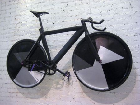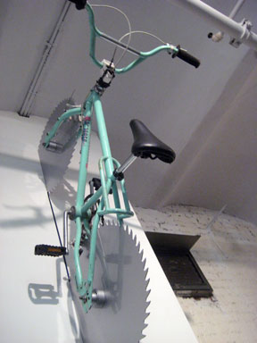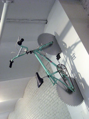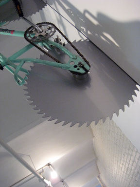 BENEDICT RADCLIFFE, London, ‘Still the One’, 2005, metal, circular saw and paint. this bike hung from the wall, just under the ceiling – so that you could unwittingly, and many did, stand underneath the lethal looking back wheel !! while many others watched and hoped it was attached securely.