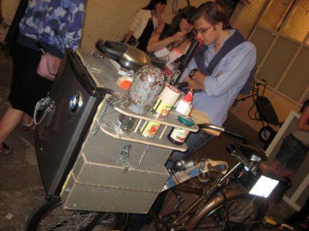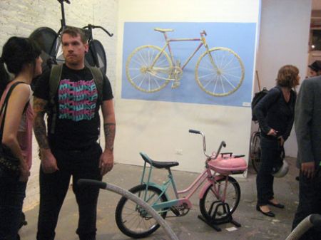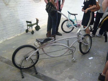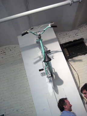 and last, but not least, though maybe … least – a ‘celebrity’ bike contributed by TOM SACHS. TOM SACHS, New York, ‘Waffle Bike’, 2008 – it looked like he told his studio assistants – throw me up – a custom bike – like I would make – If I actually made one. It was there for the opening, but then quickly disappeared, …said the gallery assistant – “his gallery wanted it back – it’s like worth a half a million dollars”.