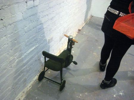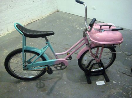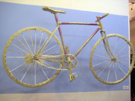 foreground, ‘The Best Little BBQ’ bike, and on the back wall – GRACE YUNG TING TENG, from Dallas – ‘Untitled’ , 2008 – a cardboard, paper and metal bike.