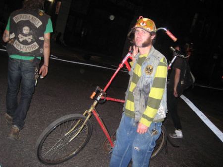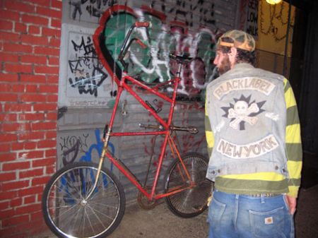 . . . “Black Label Bike Club is an international freak/mutant bicycle organization specialing in tall bikes and choppers. Started in 1992 by JACOB HOULE and PER HANSON, as Hard Times Bike Club in Minneapolis, Minnesota, the club has grown to include a chapter in New York, Reno, Nevada, Austin, Texas & Stockholm, Sweden, and a nomad chapter loosely based out of New Orleans known as Nowhere. The Black Label Bike Club is credited with being the first “outlaw bicycle club”, the originators of tall bike jousting, and one of the main contributors to the rise of the tall bike culture.” – WIKIPEDIA