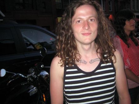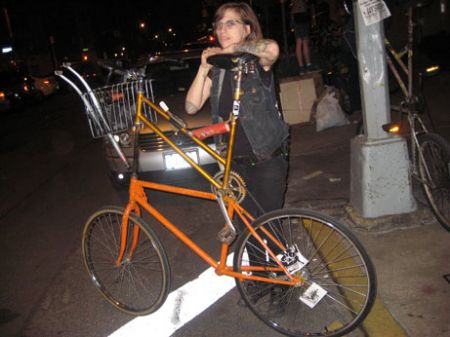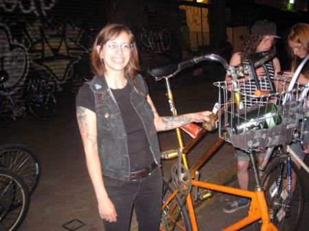 TAARNA GRIMSLEY, (at least, that’s what she said – her last name was !!) out of Bed Stuy. one of only 2 girl Tall Bike riders – in NYC !! their club is called Cutthroats and it is 6 yrs. old.
