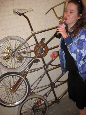 from left, LOUISE INGALLS STURGES, one of the 3 woman artists in the show, (she did the tiny tricycle, see below), and with her, KATHARINE BARTHELME, a co-curator, with BRENDT BARBUR, of ‘Dear Velo’.