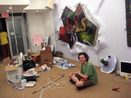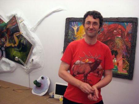 NICK COTE. beside him a selection of small wild paintings by MATTHEW BERRAIN.