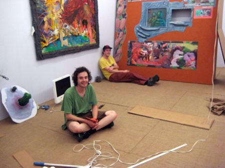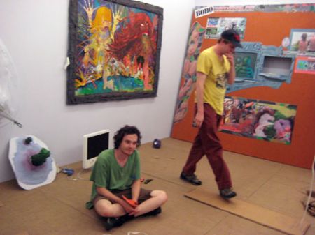 . . . apparently BOBO isn’t just a band, or even an art band – they’re a collective that runs a house gallery, in the house where they live in Philly – where the rents are cheap & the living is easy – just to keep it brief, and cool. looks like they’ve got Philly humming & now they are bringing some of that hum to our city !!! MICHAEL GILLESPIE is letting them take over FOXY PRODUCTION for the summer. we happened to catch them last week – while they were just beginning to face up to the task of getting the BOBO show on the road, unpacked & and up and running. the opening is to-nite – can’t wait !!