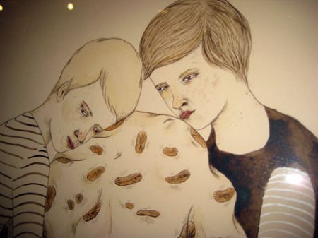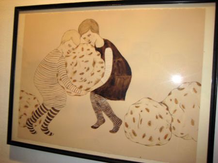 However, and most ironically – in Ms. Mellberg’s hands – these organic hand-harvested non-toxic pigments – and, in contrast to many of her creative world-sensitive contemporaries – don’t express a robust growing earth plant world !!! The yellowy brown stains and mottled details of the overgrown diseased potato/fungus/mushroom-like rock the girls are ‘collecting’, and the red measles-like dots on the young girls’ own faces and arms – suggest something’s gone wrong – these organically scripted drawings – speak of almost invisible toxins and subtlely diseased eco-systems – they do not augur well for the future.