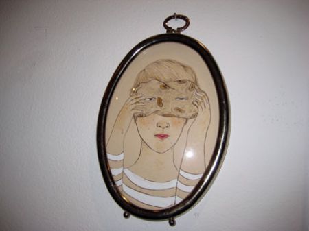 just like this portrait – its a kind of reverse decadence. instead of a dark 1930 Berlin cabaret dancer or an equally flamboyant American 20’s flapper – throwing her fur with glorious abandon about her neck – here – well, you get the picture !!! in fact some aspects of her work – brings to mind, for me anyways – BARRY McGEE – his sorrowful decadent world weary – faces painted onto glass bottles.
