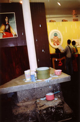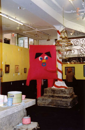 the first outing of TAYLOR McKIMENS, ‘The Drips’ !! well, first there was this really strange but actually a-m-a-z-i-n-g, what-the-hell-is-that , literal ‘tableau’ of (paper) water ‘drips’ heading into pails and cups of some fake some real – water !! you really didn’t know what to think, but it was cool. and then there was a real ‘DRIPS’ family member in the back, in the oval frame on the yellow wall. that weirdo buttnaked chubby guy riding on tractor, with a blue lampshade over his head !!