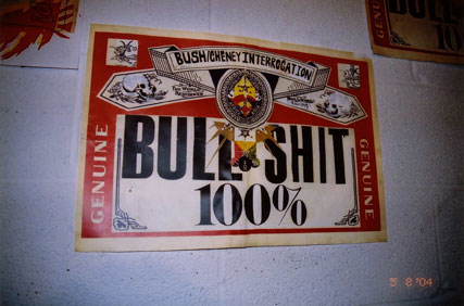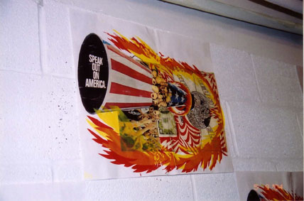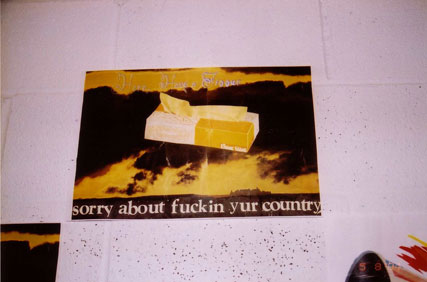 “sorry about fuckin yur country” – its addressed to the people who took down the WORLD TRADE CENTER !! these collage posters were distributed freely, in a limited quantity at the opening, and if you were sharp you scored one, did we ? OF COURSE !! NO BRAINER !!