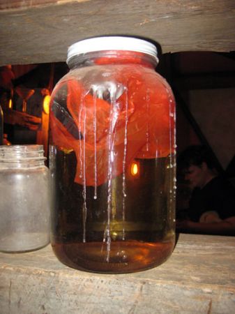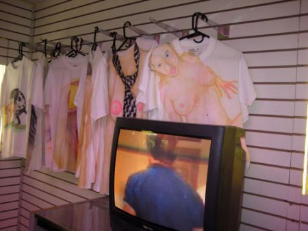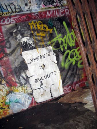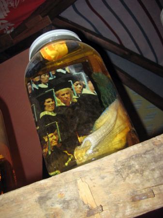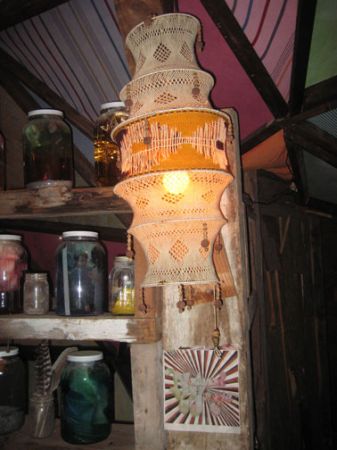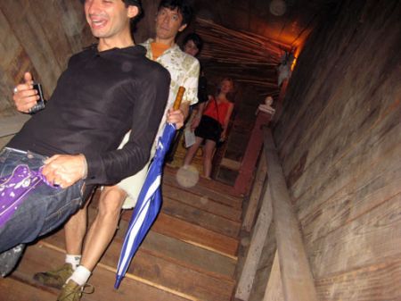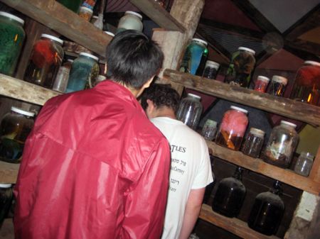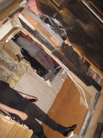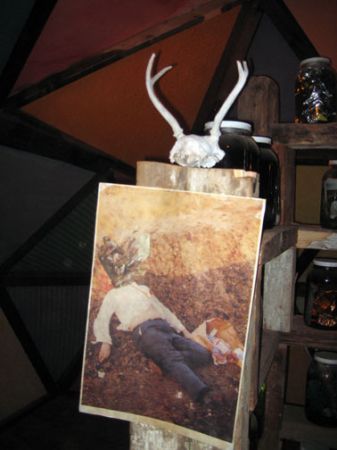 art wise – it was a simply a big production that just didn’t fly. distressed sinks, and all. painted t-shirts and jars. but no real light bulbs. like ? look no further than Michel Gondry’s recent Deitch exhibit, ‘Be Kind, Re-wind’. a brilliant set construction, a brilliant ‘construct’, as in idea . . even DAN COLEN and DASH SNOW’S ‘NEST’, also at Deitch – and a very simple deconstruct – killed this one, hands down. actually all the woodiness of Black Acid Co-Op brought to mind the URS FISCHER installation, of a few years back – his Bird House made of bread, at GBE – which if placed side by side in time and space – with Black Acid Co-Op could have taken this whole month-long multi-construction down – with one dough-y arrow.