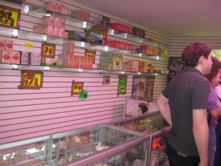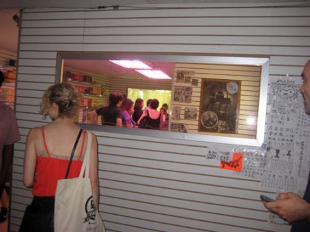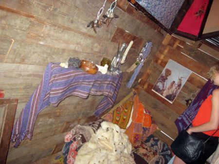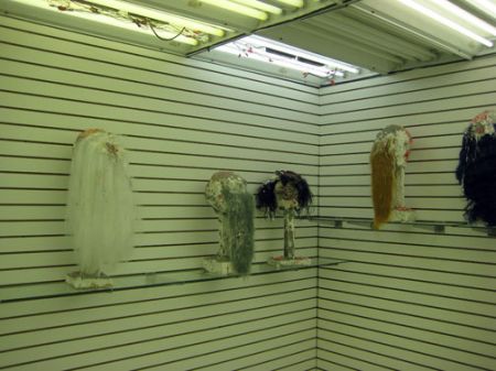 of course if you were lucky enough to catch JUSTIN LOWE’S ‘HELTER SWELTER’, (see: HELTER SWELTER/scroll down !!) at OLIVER KAMM’S GALLERY, way back in the heady days of 27th Street, SUMMER 2006 – you might wonder – what went wrong, this time. ‘HELTER SWELTER’ was not only a brilliant re-creation, minutely detailed, of a NYC bodega in the small entryway of the gallery, but it opened up into an amazing communal and totally off-the-wall open space, where gallery goers could sit in a dark space on hand knit rugs !! and they did !! – and this ’empty’ space actually took up most of the remaining the bulk of the gallery – behind the magic school bus. guess you had to be there. esp opening night. believe me, that was some party. but, even then, it was almost as if Mr. Lowe’s ambitious intentions over-shot the small gallery and aimed (sorrowfully) for a big-time DEITCH BLOW-OUT. How sad but true, sometimes you have to watch out – for what you wish for. and although the bodega and the school bus were a re-creationist’s dream – again the contrast between the highly detailed storefront entrance and the bus – against the empty inner room – was the dynamic that made the whole – take off. that gave the painstaking re-creations – heart and soul. took it one big step up – into legendary. they for sure could have used something along these lines in Black Acid Co-Op Summer 2009. the minute detail amidst the spatial ‘construct’ was what blew the ‘HELTER SWELTER’ out of the water. it was the contrast between the highly involved ‘sets’ and the mysterious, cave-like people space that made magic. there were even seats to sit on, on the magic school bus !!