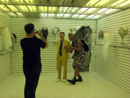 but the experience became unrelenting. deadening your senses to what lay around the corner of the many twist and turns. in fact the whole show became a kind of JEFFREY DEITCH vs. GAVIN BROWN … enterprise … in my head. whereas Gavin provided a huge welcome-all BBQ, and all the beer you could drink – with picnic tables, and even overhead tents on the sidewalk in case of rain, hard core art fans who made it through Friday’s super heavy rains the night of the Deitch opening found naught to greet them, except the spectacle of the unsocial and uptight Deitch ‘leader’ in his yellow linen suit, reveling in his usual self-congratulatory state, amidst the smug uncoolness of the disproportionate number of ‘insiders’ – who made sure to tell you – they were waiting around for the private afterparty !! It left a bad taste – to what should have been a huge street bash.