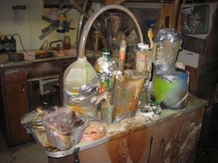 I didn’t see the Marfa METH LAB, or see enough pix or buzz – but I think the big success and impact of the METH LAB, in Miami, must have been that it was done the stairs, in the basement, of this gorgeous brand new hi tech hi rise tower !! must have made it feel even more, like a clandestine Meth Lab, for real !! and, of course apart from all the raves about the cutting edge art – all you hear about the MIAMI STATION – was what a great party ELEANOR CARYE threw – so voila. there you have it. METH LAB in play, artists at work, vs. Black Acid Co-Op – totally co-opted.