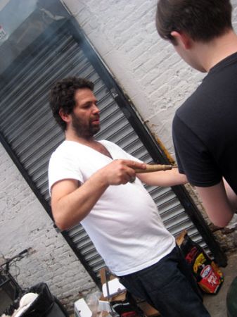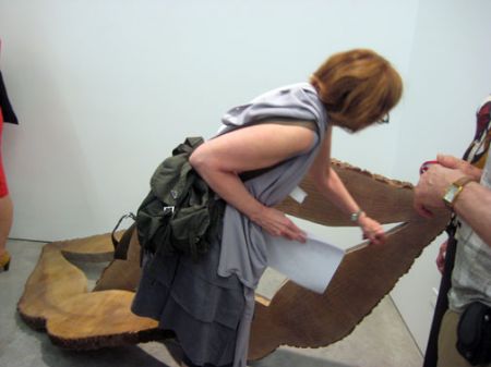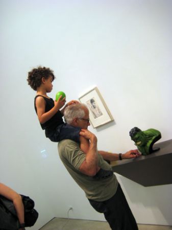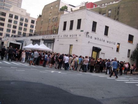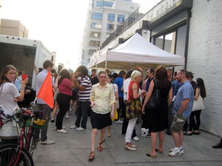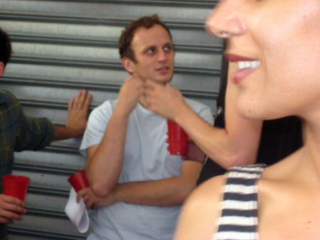 . . . it was a big big street party/BBQ with Gavin himself grilling up the burgers all night long. Rare sunny summer weather held, as if to smile down on the festivity, though there were some tents put out as a precaution. Gavin is a great host and everybody had a great time. Happy spirits prevailed, as friends got on their cellphones and word of the good time quickly spread. the only complaint – the long line for the free flowing beer inside – but, hey you got to stand under that – really funny – URS FISCHER piece !!