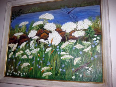 He told me started painting when his kids left unfinished a ‘paint by numbers’ set in the 1970’s – he didn’t complete the given picture, he just took up the brushes and the left-over paints and started his own painting.
