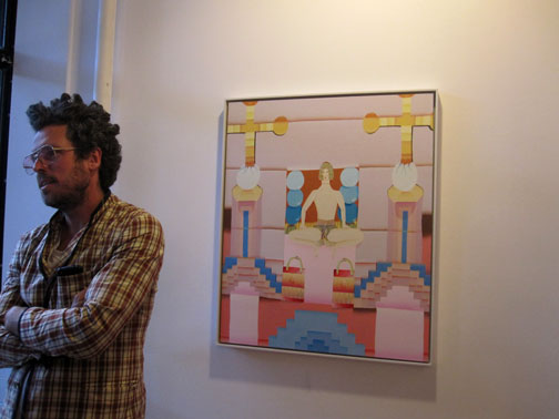 the show featured an arrangement of new, and curious !! DEVENDRA BANHART works on paper . . . they were small, in the range of 12 x 9 in. , and very intense. eyeballs – that could almost be taken for, well – bullet holes. very different from the works of his, we have seen in the past, which were mostly spidery line and dot and dash drawings. and usually incorporating words – and done only in black ink. these were in color and had full color spectrum-inducing backgrounds. gouache and pencil on paper. the price range ? approx $1,800. not bad, at all.