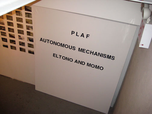 the sign for the show: PLAF – AUTONOMOUS MECHANISMS – ELTONO & MOMO !!
