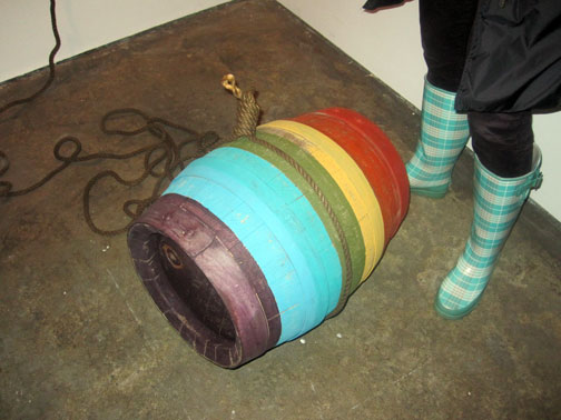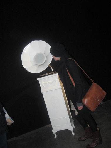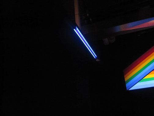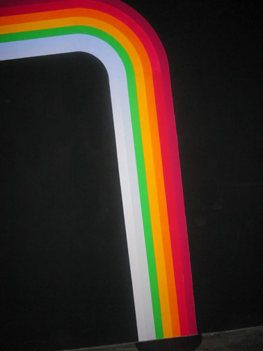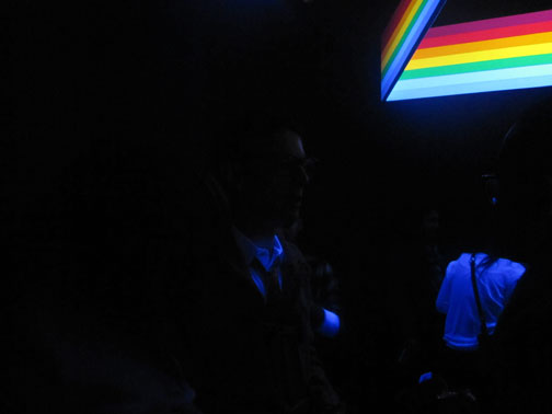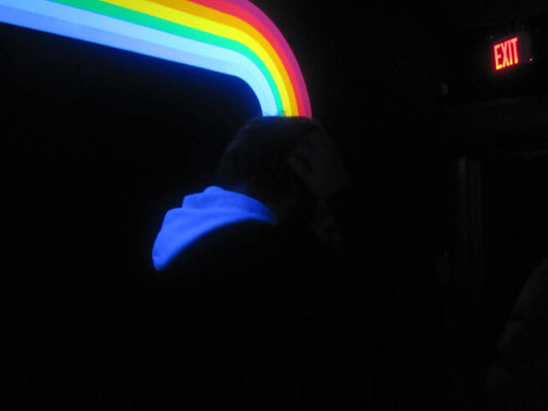 cause you walked right into another black tunnel – the entire front room of the gallery – pitch black – bathed in black light !! except for a neon rainbow and a vintage victrola – the Ear Candy Machine !! – playing music composed and performed by Jack Early and a few friends.