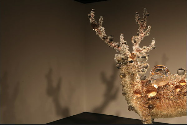 “In a way utterly foreign to the plastic Hello Kitty universe, much of what’s in the Japan Society show is, for better and worse, about organic change. You see this in the scarred faces of MOTOHIKO ODANI’S wooden Noh masks, and in KOHEI NAWA’S ‘PixCell-Elk No. 2’ – a taxidermied specimen covered with translucent plastic globes that look luminous but also pathological, like growths from genetic experiments or excessive radiation.”