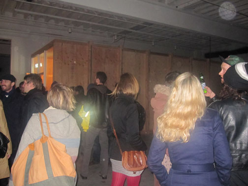 item: the enclosed plywood cube of a free-standing makeshift gallery. not only is this humble viewing space so superior to the standard white box – as an experience – but, who knew plywood could cast such a beautiful hue ?