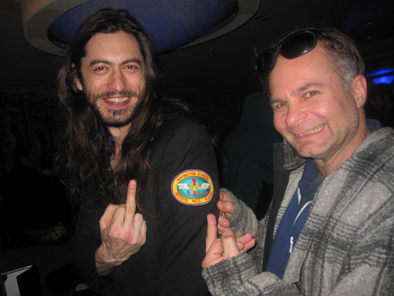 on the bike, LINUS CORAGGIO. beside him, the indie curator JOHNNY V.