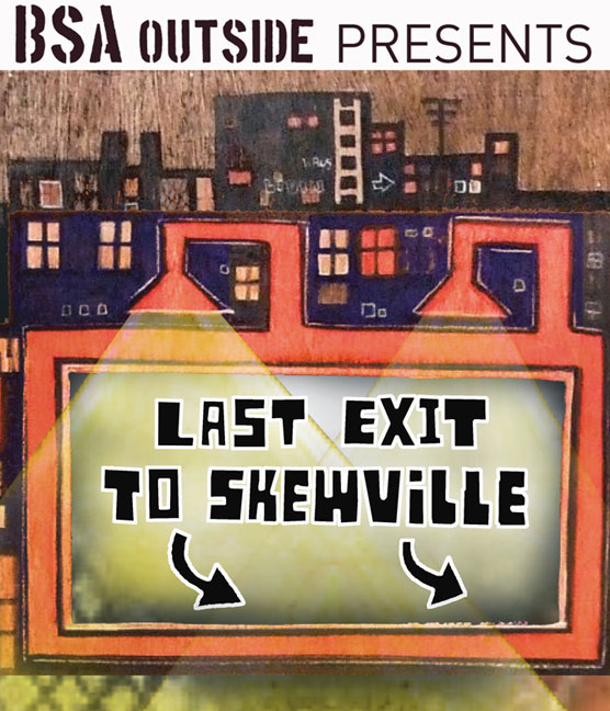 so stroll by, hipsters – and get a fresh take on the SKEWVILLE “warped crooked sense of irony and humor . . . with a specific style of lettering, abstract figures and cityscapes that are instantly recognizable by Street Art fans everywhere. ” (BSA)