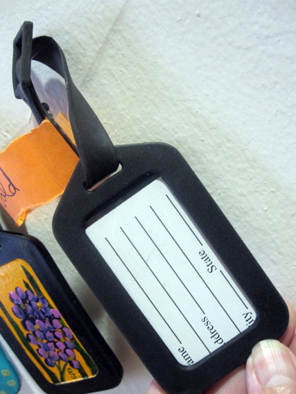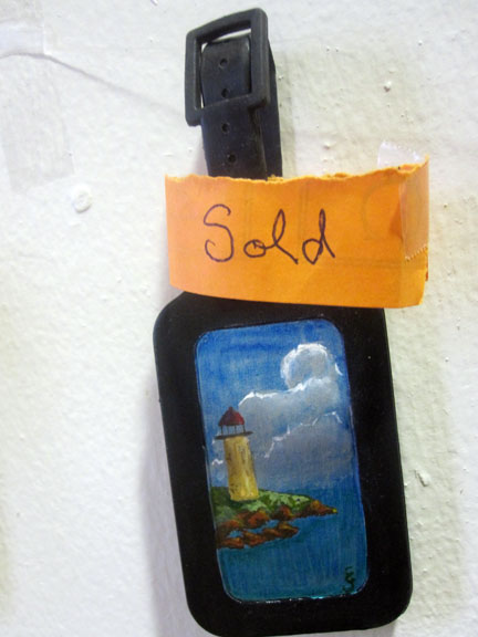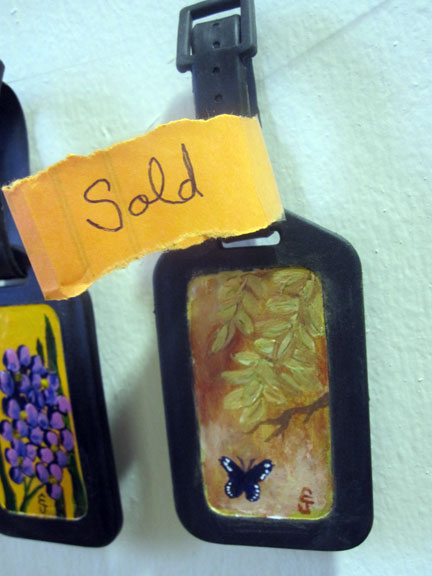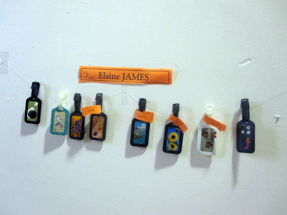 ELAINE JAMES, who helps Diane Lombardi-Fleming organize the show had a new trick up her sleeve this year, a small selection of her diverse range of handicrafts: this time – hand painted luggage tags.