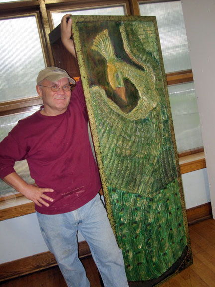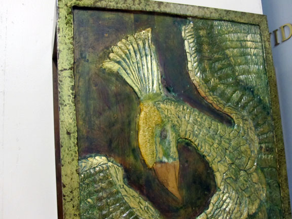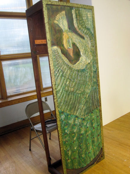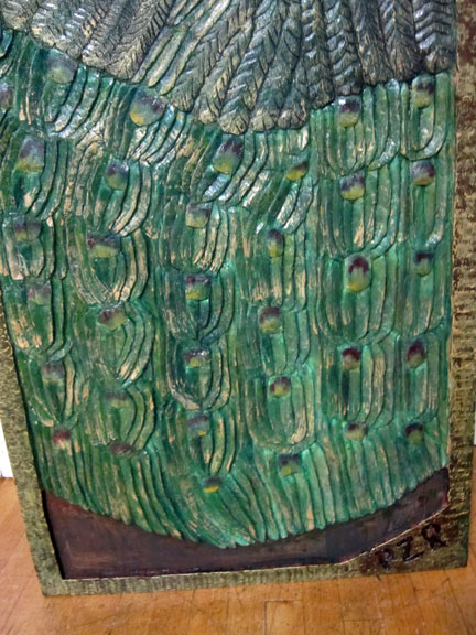 a vintage ‘found’ stand-alone wooden closet – that he had carved into with a most wonderful peacock design. . .