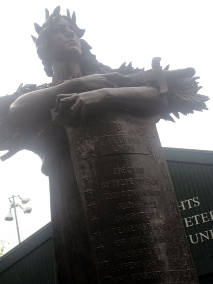the words on her shield read: Erected JULY 4, 1922 in grateful remembrance of the labor sacrifices and suffering of those who fought suffered and died in the World War that the blessings of free government might live.