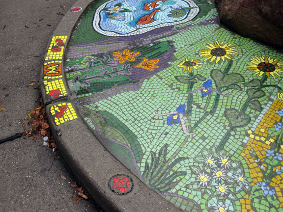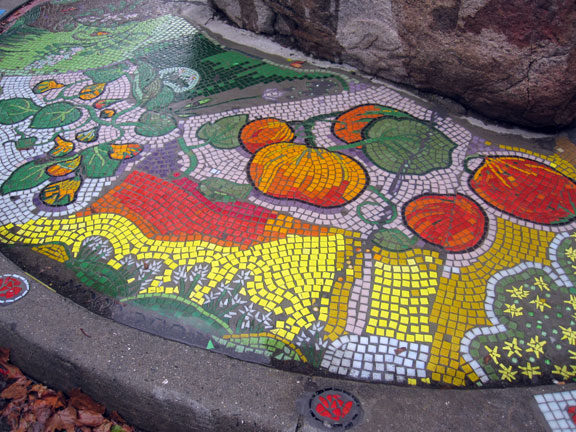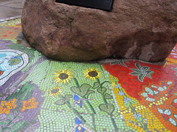 the base is a bold stroke of inspiration. a totally, very timeless – zen boulder – upon a most intricate and colorful tile mosaic – which I believe represents the four seasons. depicting the earth at its best and most wonderful organic self.