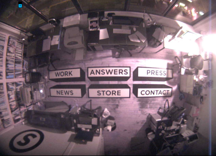 the homepage for influential designer STEFAN SAGMEISTER’S New York City office – is a real time webcam scan from above. the decal stickers on the floor, CONTACT, PRESS, STORE etc – are working links to further info. this format took effect sometime around December 14, 2010.