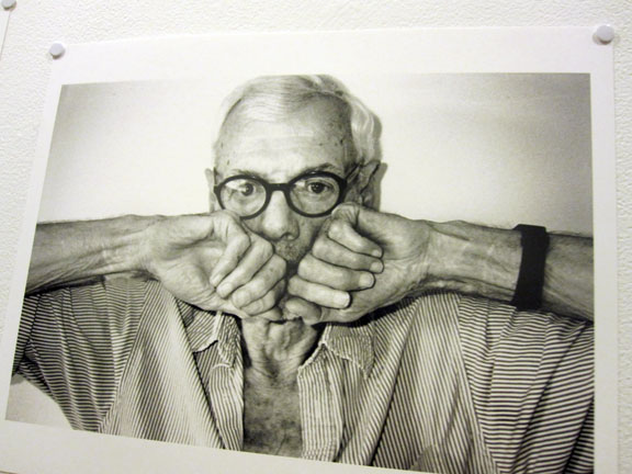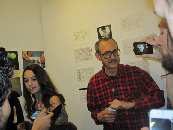 Terry up at bat. the pix on the floor were just as mesmerizing – as the pix on the wall. but also loved how they spoke to: down with art objects, the relentlessness and unstoppable march of time, the fragility of the human condition, and of course – hard copy before the age of computers & digital cameras !! and the absolute bad boy disrespect – !! – as they all ended up being pretty trashed by the end of the nite. though they remain, however they devolve – and rightly so – as part of the exhibit. someone else can write the thesis.