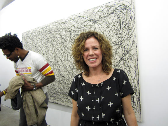 HEATHER FERGUSON, GERALD FERGUSON’S daughter at the opening, standing in front of her dad’s painting . . .