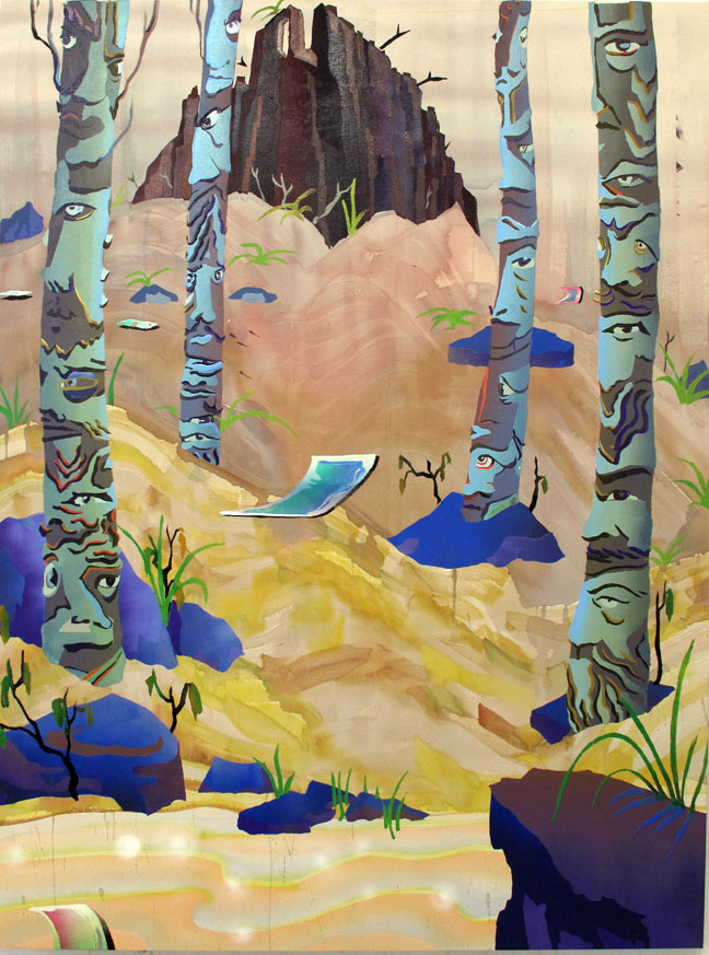 In ‘Palisades’ pareidolia manifests itself in the form of anthropomorphic and multi-faceted rocks and plant life unique to the region. In the paintings, these elements are transformed into resident, totem-like characters, their weathered faces suggesting the area’s ancient geological past, while simultaneously underscoring the region’s urbanized present. The works thus become suffused with fanciful allusions to the ghosts and vestigial presences of former inhabitants of the area.”