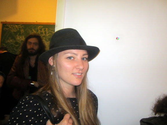 RAINGER PINNEY’s newest piece had people coming to the ‘basement’ and hanging around. it was a time-delayed on-site streaming camera – with the black & white image stream projected onto a semi-transparent scrim. it had an ambiance all its own.