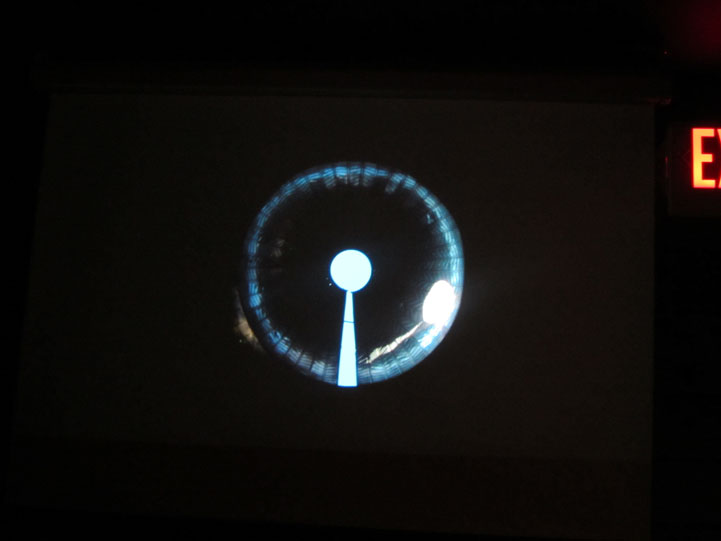 it kind of looked like an eyeball and a clock, with a tiny futuristic spaceship, here at center left, hugging the rim, as it travels around the orb. metaphors for space, time, travel, the human condition, and comparative scales – come to mind.