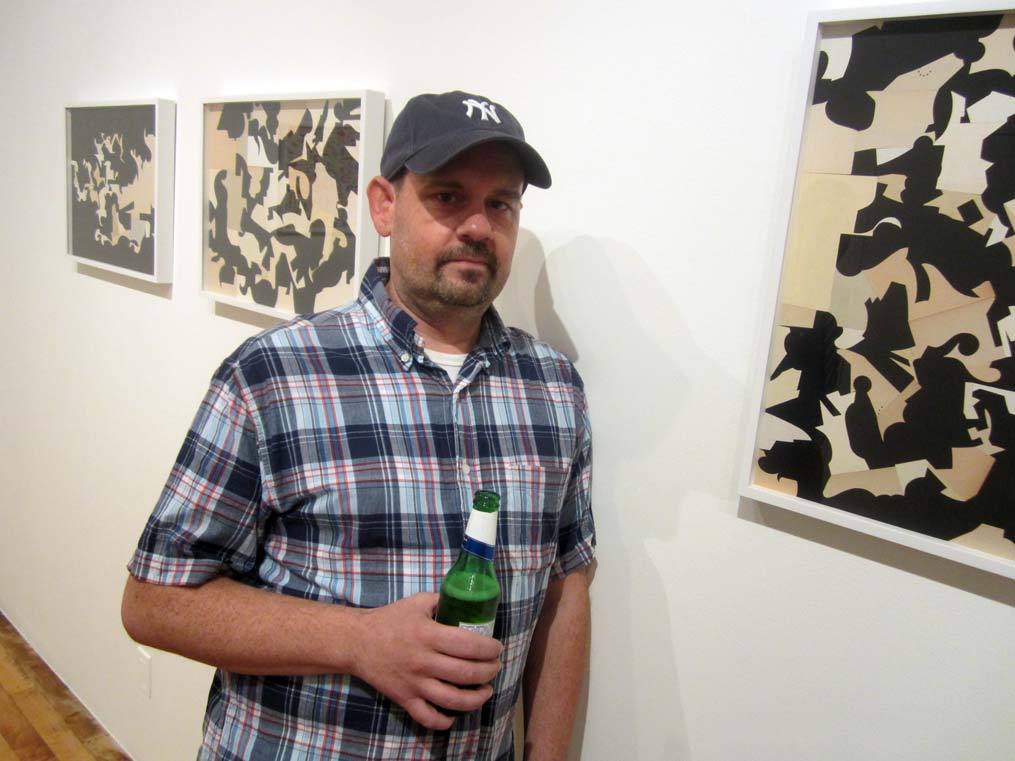 behind him: ‘Remnants series’, 2012. Hand cut paper collage. approx 20 x 30 in. ea.