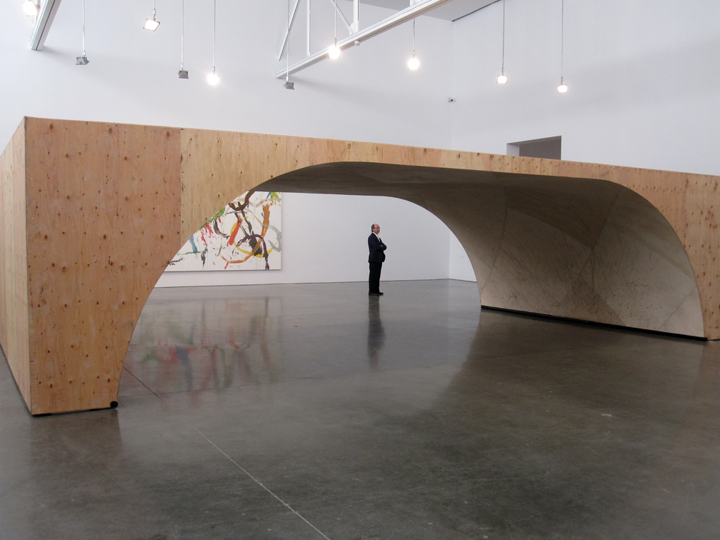 Half Pipe made of plywood, metal. 92 (H) x 192 (W) x 368 (L) in.