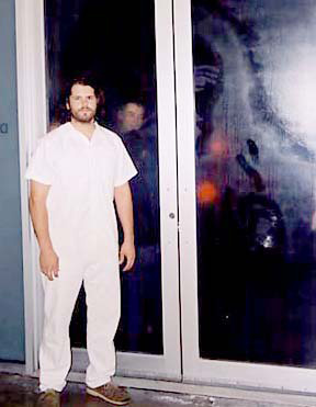 “Artist MICHAEL DAY JACKSON with his window painting, ‘Jesus Gives’, (2003), in ‘SPIRITUAL HUNGER’ at DANIEL SILVERSTEIN GALLERY, CHELSEA, NYC. SEPT 13, 2003.”