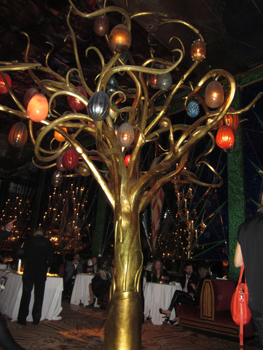 it took place at the RUSSIAN TEA ROOM, and was set in stages, with a dinner/buffet first, and then carnival reveling with gallery artists .. and late night dance party following. the dinner was lavish. the food was just spectacular. baked salmon in dough, roast beef and some kind of lobster/seafood .. served plentifully at manned stations, roaming servers with trays piled high with small specalities. open bar. 2 of them. all of it was sublime, and normally high-charged New Yorkers just sat back, and relaxed .. in the darkened and ‘stained glass’ ambience.