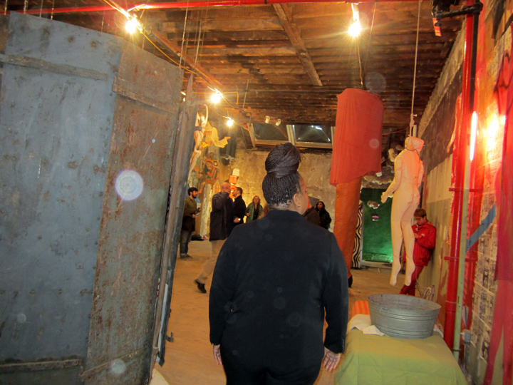 this is SPENCER, I believe he is also a musician, or is a musician, but . . he made that large, primitive, folk art like woman’s body, from just under the waist, that towers over the exhibit’s ground floor.